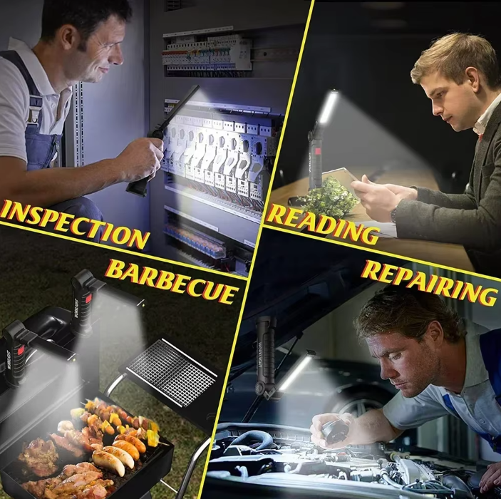 5 modes: LED haute COB, LED basse COB, LED, lumière rouge (longue pression), lumière rouge flash